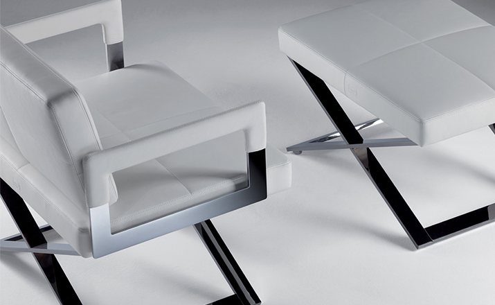 "Leather皮革椅系列家具线条干净简明,“X”交叉造型或者“H”造型脚架支撑着坐垫,新颖独特,由Jean-Marie Massaud设计。它采用外露的金属架,有三种不同的做工,座椅为聚氨酯泡沫材料,靠背较低,坐垫宽敞。有两种面料可供选择:天然皮革和纺织面料。两种款式都有皮革和染色纺织面料的扶手和同款的靠枕。沙发椅的造型形式严谨,它的特点和个性特征与Poltrona Frau现代室内家居的设计非常统一协调。