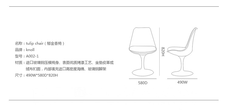 沙里宁郁金香扶手椅设有铸铝底座。外壳是用增强玻璃钢材料完成。座垫是可以可拆卸更换的,有拉链锁扣。