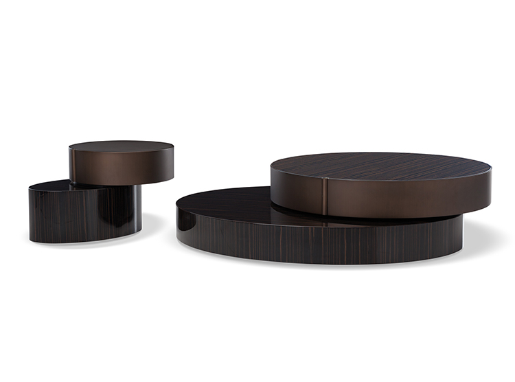 重叠的造型搭配珍贵的材质,这就是Benson的独特之处。木材的质感和金属的光亮感完美展现出雕塑般的造型。Benson边几可以直接放置在地面上,有两种不同的尺寸可供选择,以满足不同的功能需求。尺寸为120x95厘米的版本,基座为椭圆形,上方面板为圆形,配备的机械装置可以使其旋转360度,增强边几的延展性,使其更加靠近沙发座椅。直径为46厘米,高度为38厘米的版本,专门用于放置在沙发和扶手椅的侧方,有以下组合可供选择:一种是下方台面为亮面乌木,上方台面为亚光铜色板材;另一种是下方台面为Moka色亮光漆,上方台面为金色亮光漆。