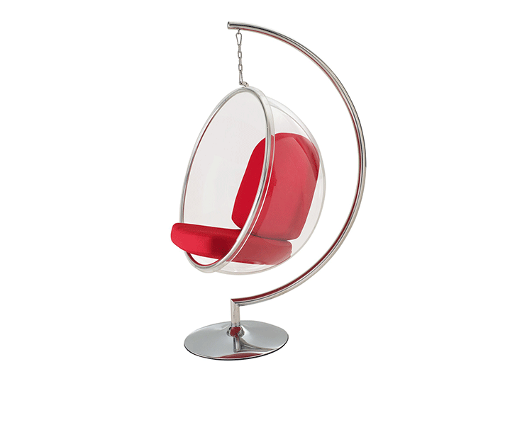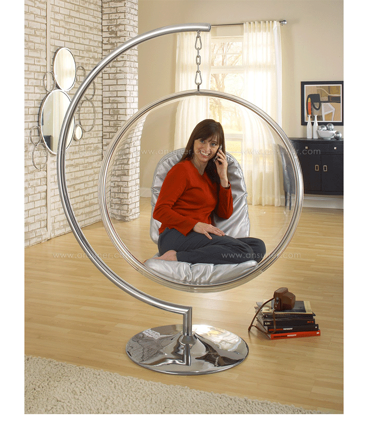 "芬兰家具设计大师艾洛.阿尼奥(Eero Aarnio)在德国品牌Adelta的代表作Bubble Chair(泡泡椅)。灵感来自于Ball Chair,但尺寸略小,而且椅子是以压克力制成,光线可以从四面八方透进。压克力加热充气,使它成为皂泡状,加入一个钢圈和椅垫即成。这样一组貌似轻巧的家具,但却能负重至少200公斤以上,由天花板垂链将Bubble吊起,宛如漂浮于空气中的泡泡一般!洁净面透明!带着科技感的椅子,又像置身于太空中,未来感十足。摆脱了椅子就是要放在地板上的刻板印象。最适合为摄影背景之用。坐在这把椅子上,即使身处一个拥挤的空间,也有点遗世独立的奇妙感觉。挪威一家电话公司在总公司入口大厅吊了几把这样的椅子,让客户可以在打行动电话时,有个宁静的空间。这件作品在1966年的科隆家具博览会上一举成名。