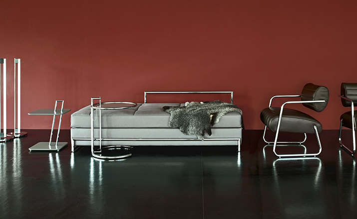 In the 1920s Eileen Gray experimented with various versions of the design of the Adjustable Table E 1027. As she changed the look of the table with a black metal top as an alternative to the crystal glass top, she also selected black as the colour for the frame. The matte black lacquer clearly emphasises the lines of the table and its form – a version she considered especially elegant. Together with Zeev Aram, Eileen Gray developed her Adjustable Table E 1027 for production in the 1970s; they both decided to produce the chrome-plated version first, with the intention to introduce the table frame in black at a later date.