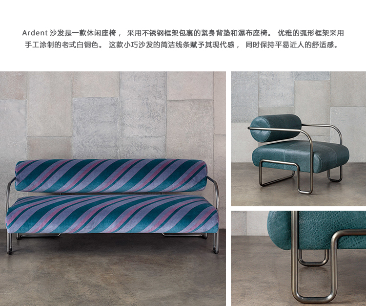 Ardent沙发是一款休闲座椅,采用不锈钢框架包裹的紧身背垫和瀑布座椅。 优雅的弧形框架采用手工涂制的老式白铜色。 这款小巧沙发的简洁线条赋予其现代感,同时保持平易近人的舒适感。