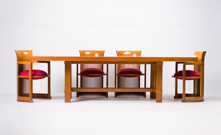 曲背餐椅,采用天然樱桃木、樱桃木色或黑色的胡桃木制造。塑料座面采用聚氨酯海绵和喷胶棉填充。座面软包为皮革或布艺面料。