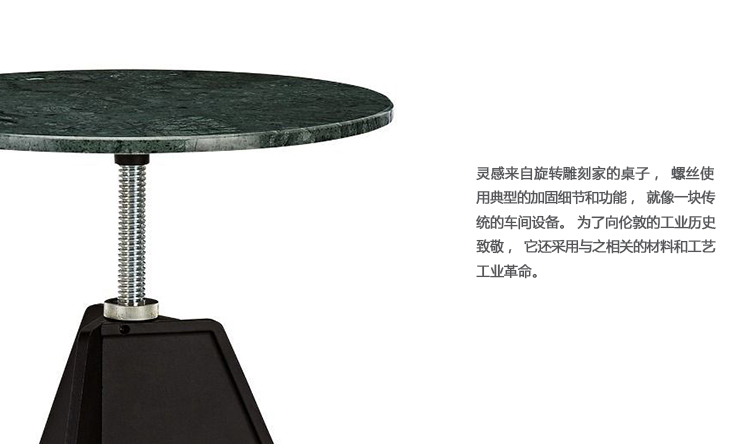 螺丝台是一种简单,诚实的设计,灵感来自工业革命的材料和工艺。 其旋转顶部位于螺纹钢杆上,可调节高度,同时坚固,耐用,优雅,非常适合在室内和室外使用。 也可作为边桌和黑橡木,气相橡木,天然橡木,天然桦木,白色和绿色大理石台面。