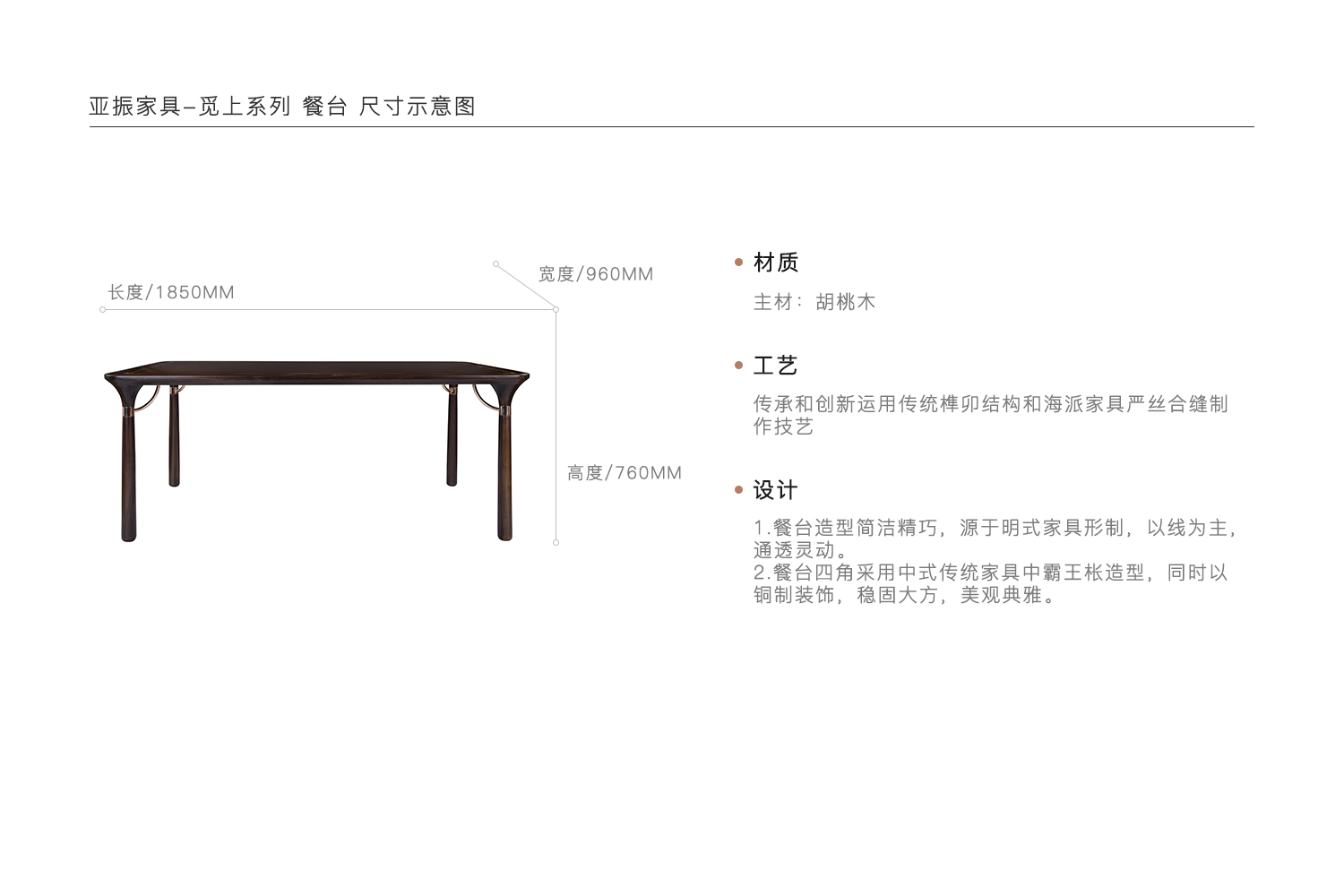 1.餐台造型简洁精巧,源于明式家具形制,以线为主,通透灵动。 2.餐台四角采用中式传统家具中霸王枨造型,同时以铜制装饰,稳固大方,美观典雅。