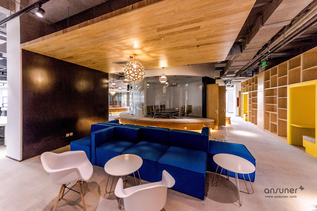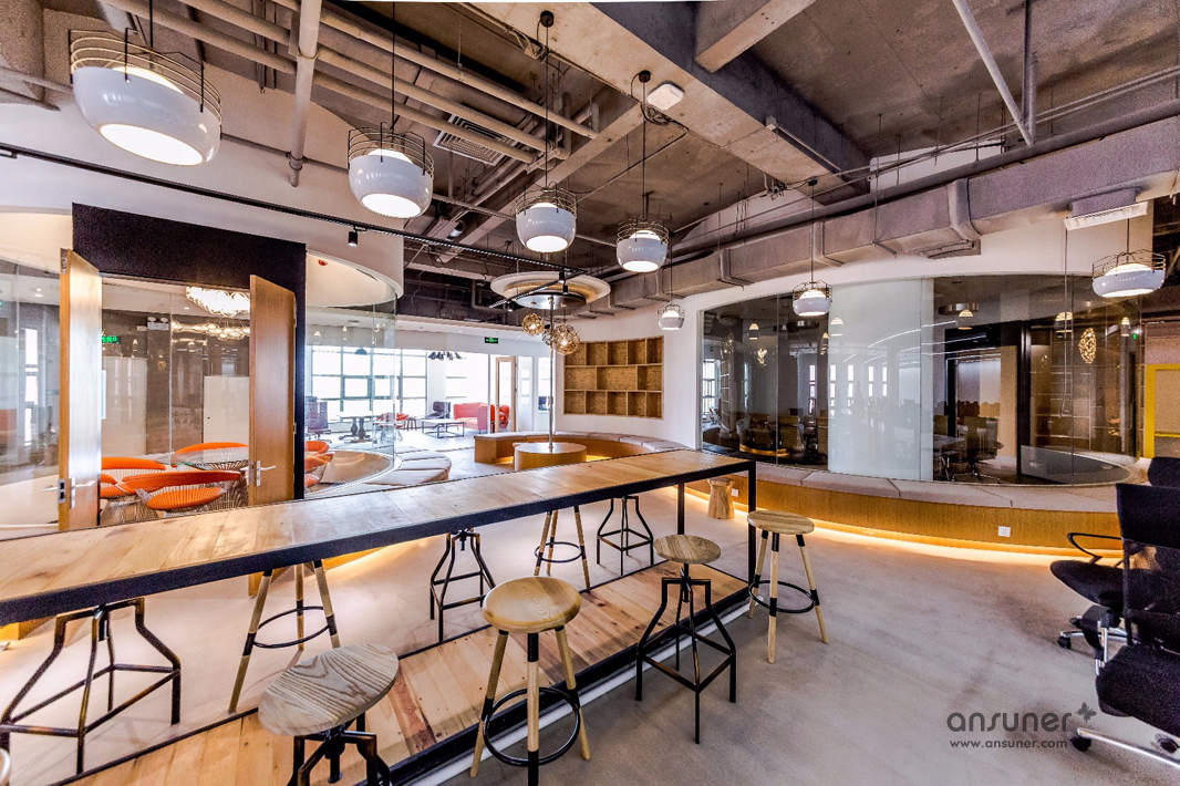圆弧形的会议室和休闲区是本次设计的核心,也是凸显共享和交融的重点,通透的玻璃会议室和无遮拦的休闲区设计形成完美的结合。休闲区的设计得益于当今的科技发展,移动式办公成为可能。标注办公桌渐渐转化为共享办公桌,多元化的移动办公方式提供了更丰富的选择。个人固定办公桌时代已经成为过去,员工要考虑的事情就是选择哪里更合适今天的心情、今天的工作。